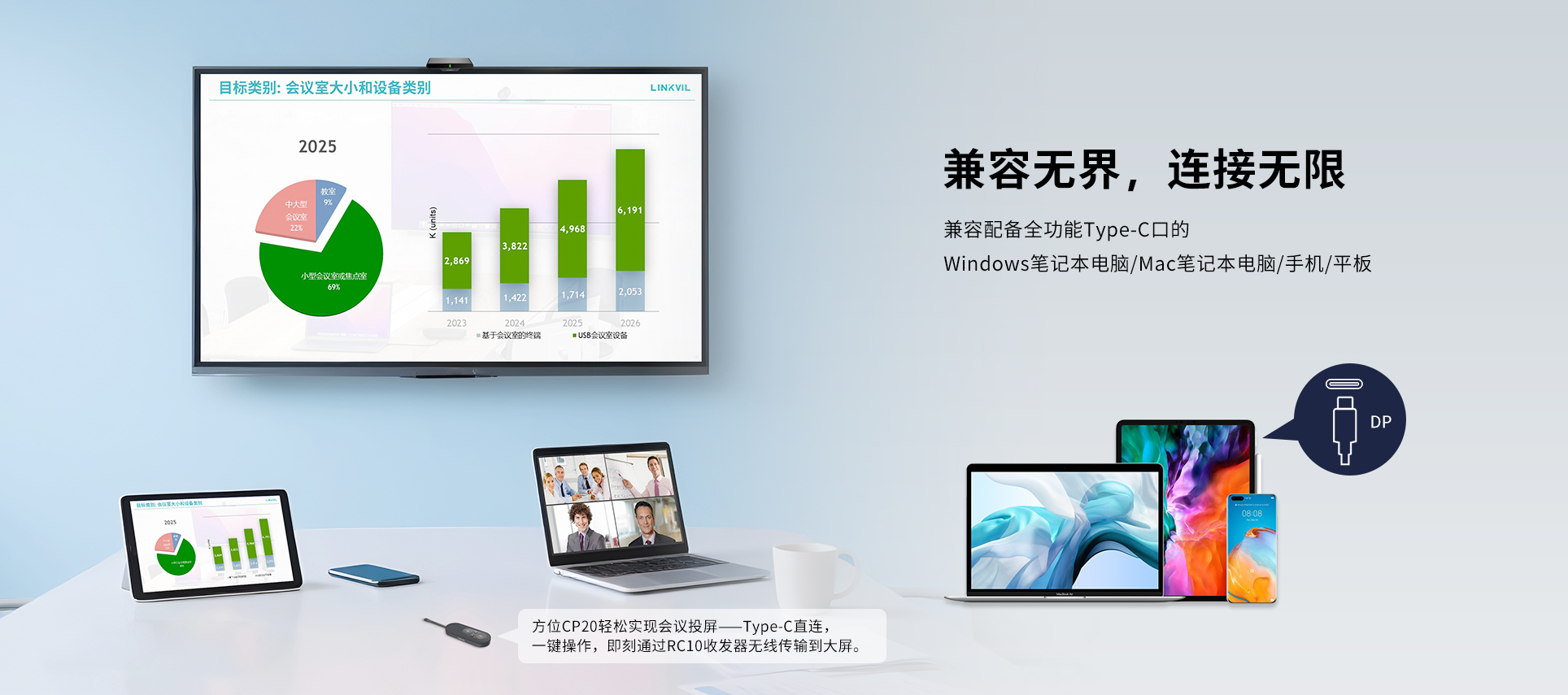 Linkvil CA200 无线会议套件,专为简化部署与提升会议效率而设计。集成收发功能,一个收发器最多可支持 4 个 CP20投屏器同时连接,轻松构建无线会议空间,无需系统集成,即插即用,省时省力。支持 4K 高清画面无线投屏,并可一键切换至冻结模式,满足多场景下的演示与协作需求。轻巧便携,兼容多种终端设备,让会议室告别杂乱线缆,带来更高效、更整洁的会议体验。