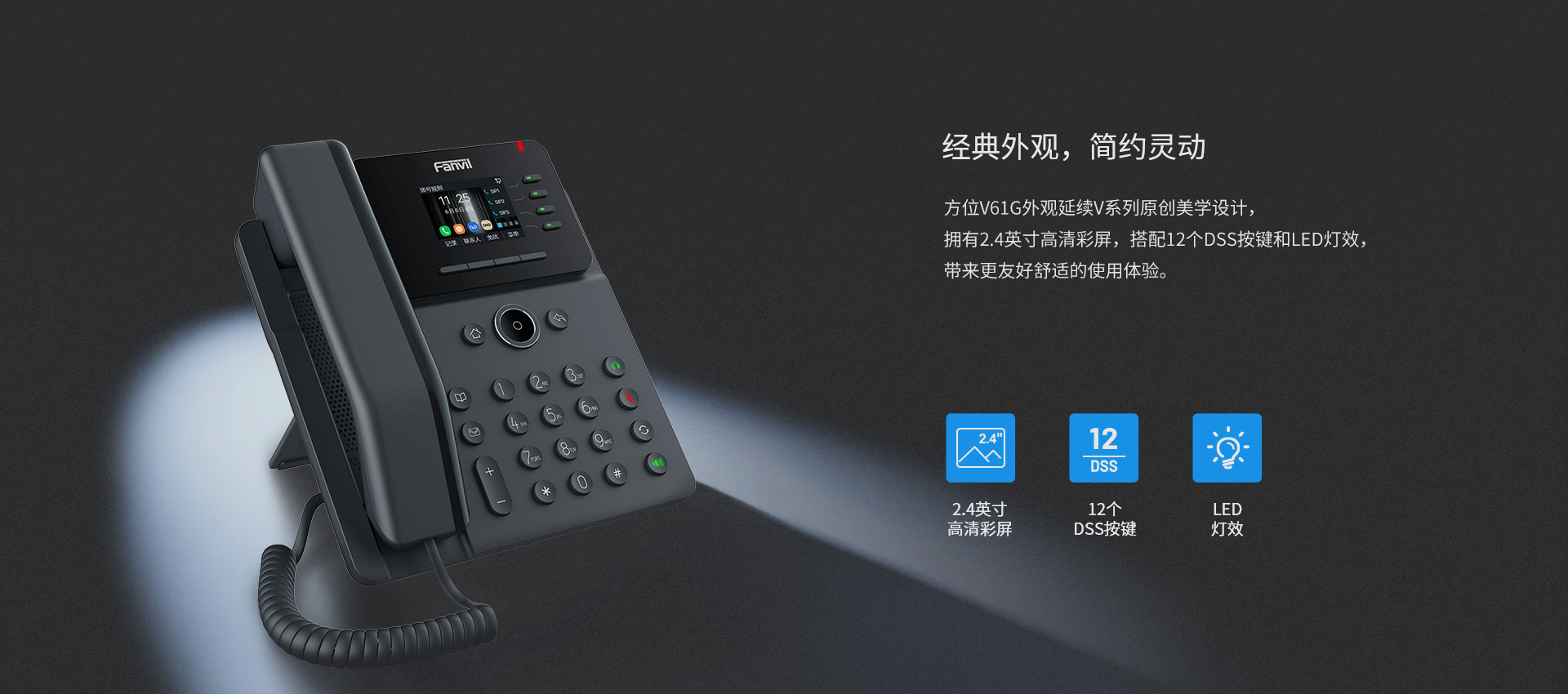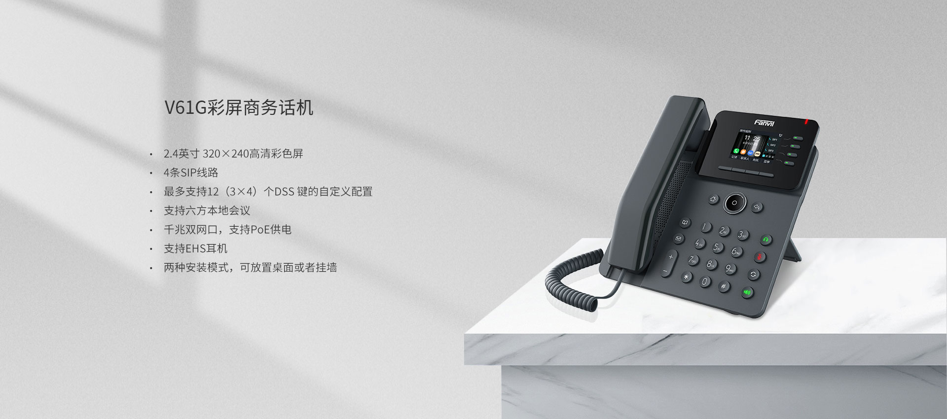 方位 V61G 是一款外观时尚、性能卓越的千兆彩屏商务话机。采用 2.4 英寸(320x240)高清彩色液晶屏,拥有 4 条 SIP 线路,支持高清语音和 6 方语音会议,支持千兆双网口和 PoE 供电,可满足不同的企业应用场景,为用户提供卓越的交互体验和舒适的即时通讯服务。