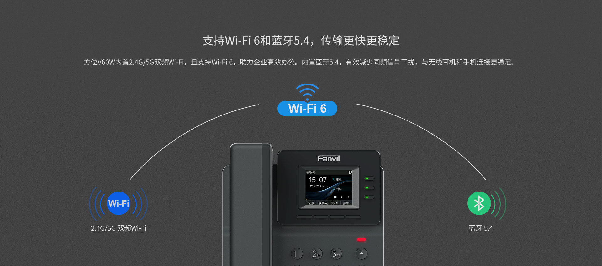 方位V60P/V60W 是一款设计简约、功能强大的入门级商务 IP 话机。它采用2.4英寸(320x240)高清彩色液晶屏,支持4条SIP线路和6方语音会议,带来清晰直观的操作体验;V60W内置蓝牙5.4与2.4G/5G 双频Wi-Fi,支持Wi-Fi 6,可满足不同企业的应用场景需求,为用户提供卓越的交互和舒适的即时互联沟通体验。