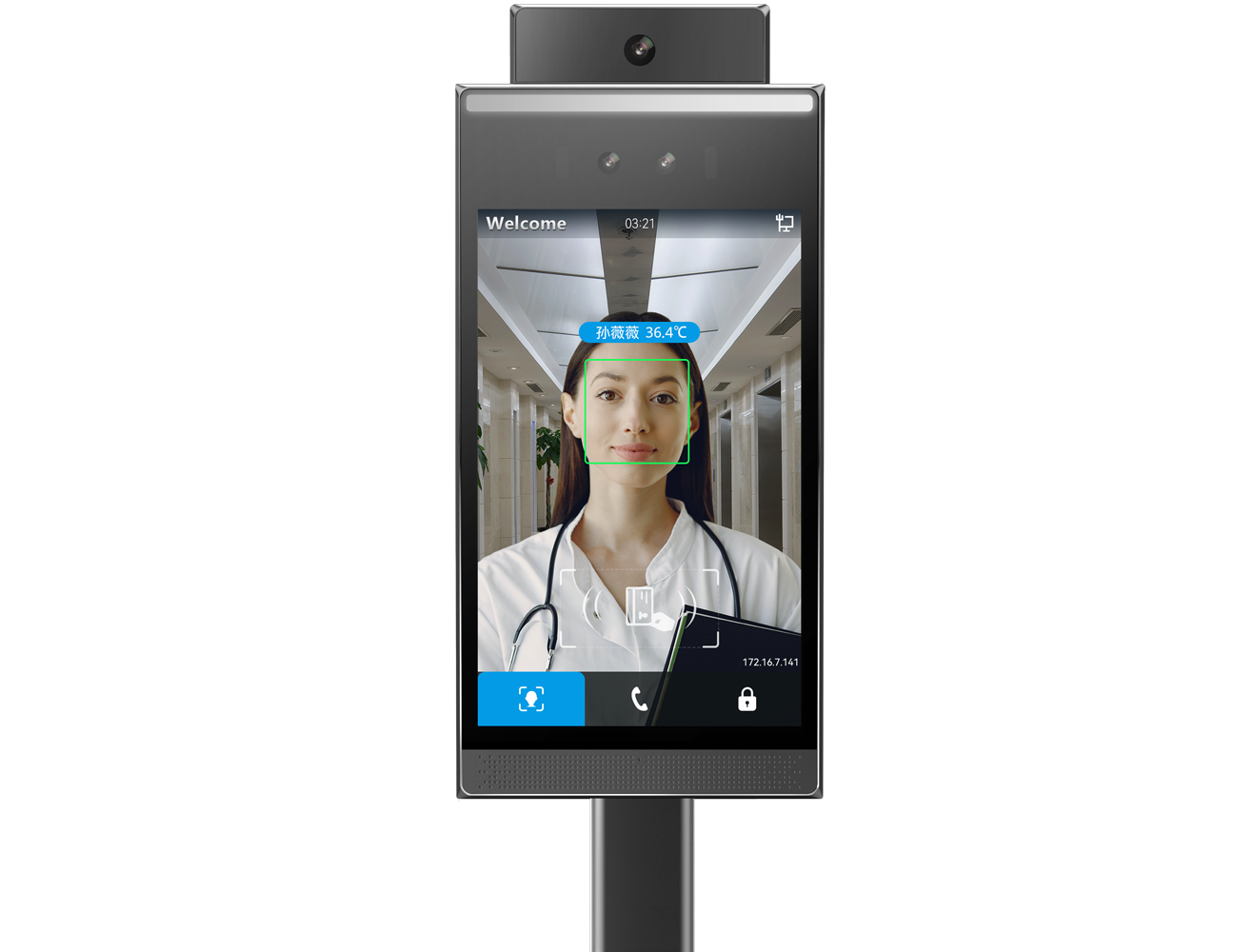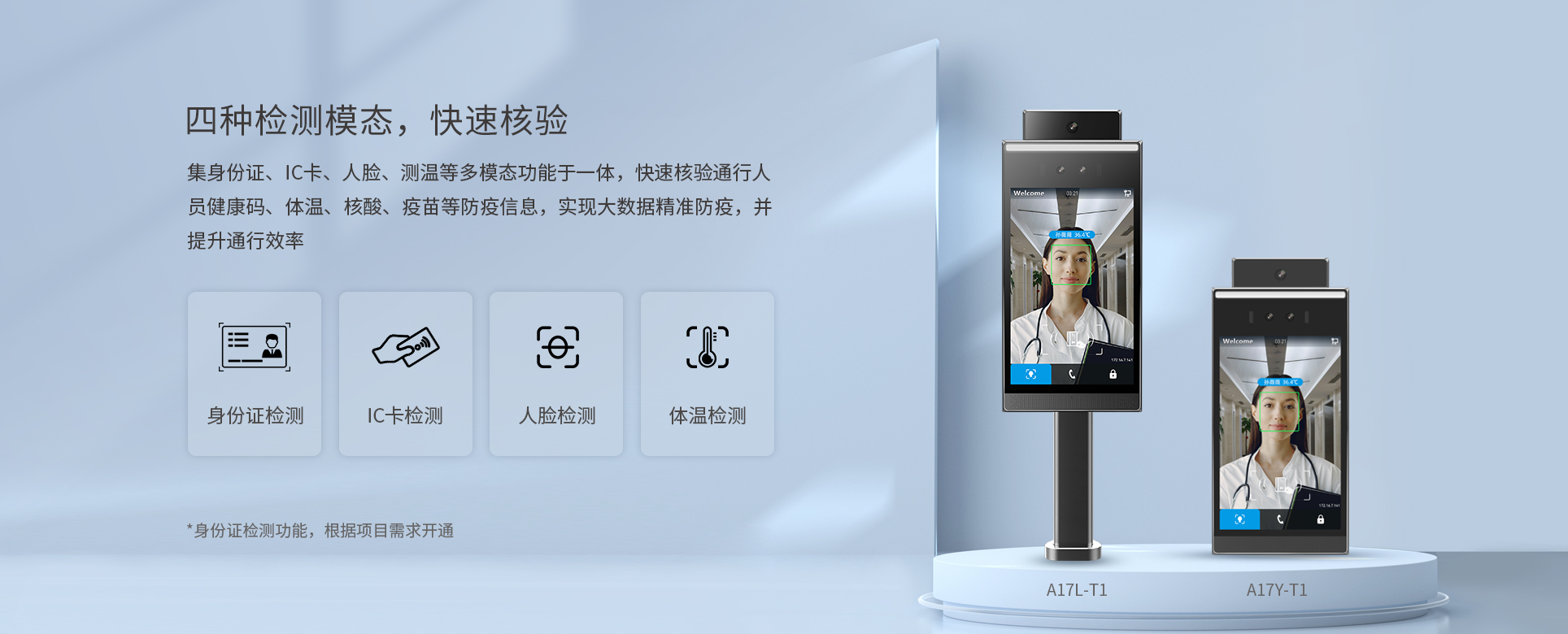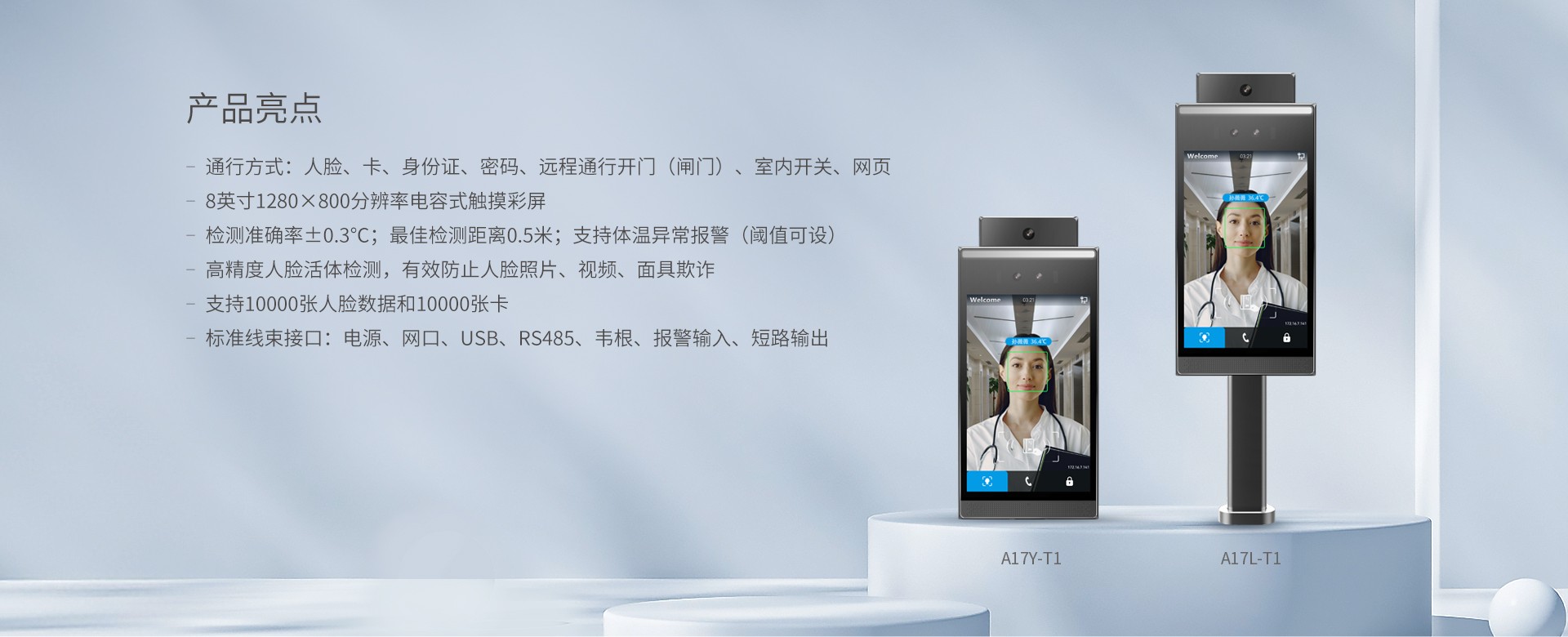 A17L-T1是一款集身份证、IC卡、人脸、测温等多种检测识别功能于一体的数字哨兵防疫终端。它采用时尚超薄的设计风格,全金属机身打造,高档铝合金高光边。A17L-T1配备8英寸高清彩色触摸屏,内置高清双目摄像头及先进的算法,支持活体检测、红外测温功能,并使用标准的SIP协议进行通讯对讲??晒惴河τ糜谏缜⒙ビ?、医院、学校、党政机关、交通枢纽等领域,高效助力疫情防疫和通行管控。